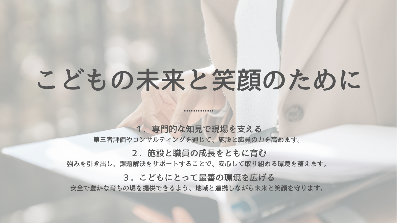 福祉サービス第三者評価は、事業者が事業運営における問題点を具体的に把握し、サービスの質の向上に結びつけることができるよう、当事者(事業者及び利用者)以外の公正・中立な第三者機関が専門的かつ客観的な立場から事業所の運営管理や提供するサービスを総合的に評価するものです。